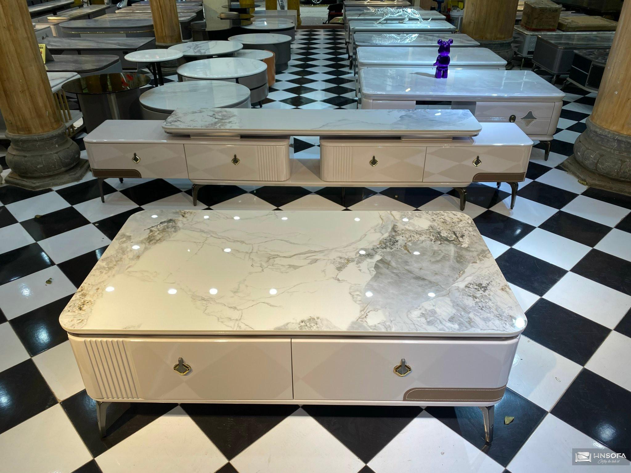 - Quy cách: Bàn trà khung gỗ, mặt đá chống trầy, thấm nước
